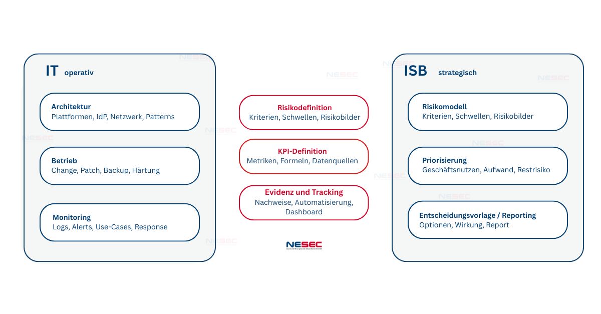 Die operative Umsetzung liegt bei der IT, die strategische Ausrichtung beim ISB. Diese Arbeitsteilung entlastet das IT-Management, weil Diskussionen nicht im Tool-Theater enden, sondern entlang von Geschäftsrisiken geführt werden. Der ISB strukturiert Risikoanalysen, begleitet Incident-Response auf Managementebene, bereitet Investitionsentscheidungen vor und schafft Priorisierungslogik für Backlogs. So bleibt die IT handlungsfähig, während Transparenz über Fortschritt und Restrisiken entsteht. Geschwindigkeit wächst nicht durch mehr Hektik, sondern durch klare Leitplanken und konsistente Übergaben zwischen Strategie und Betrieb.